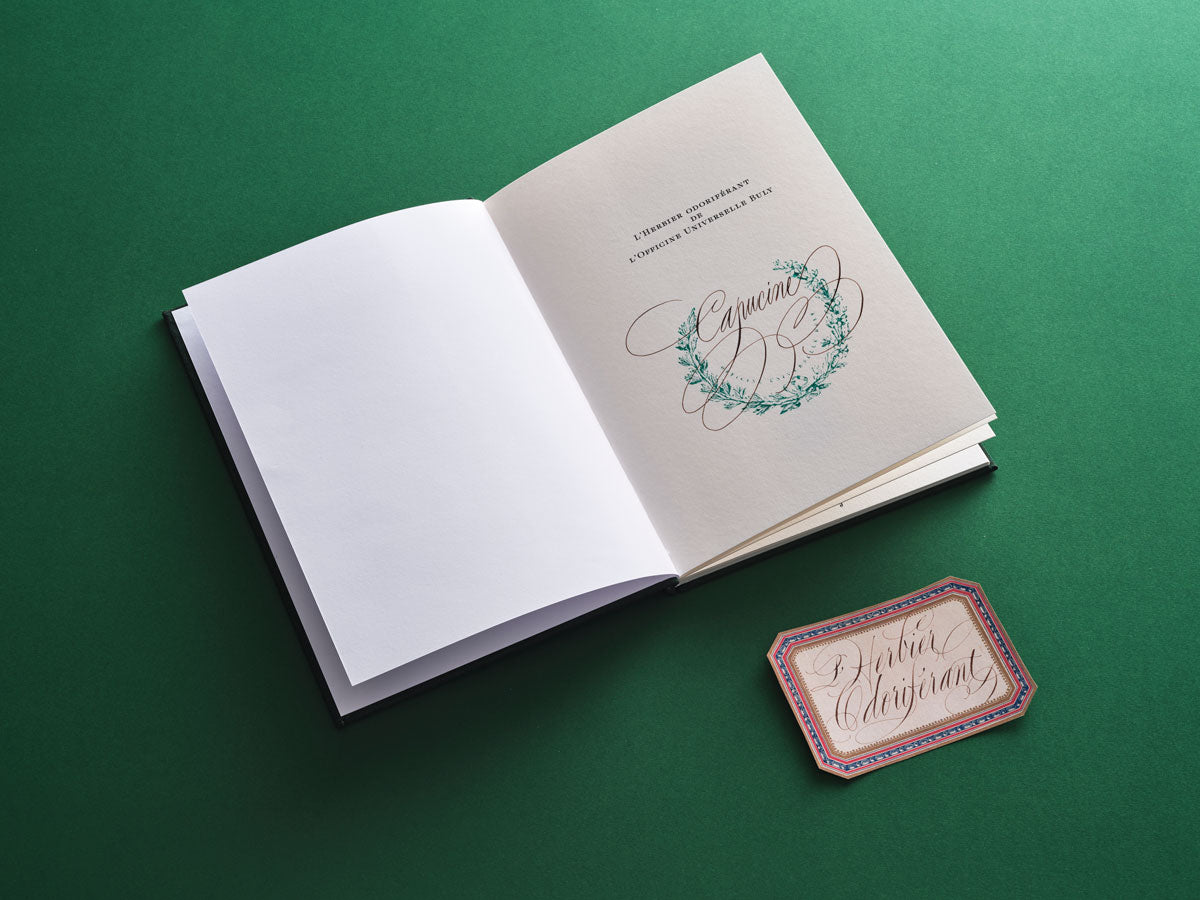 『オフィシーヌ・ユニヴェルセル・ビュリーの香りの植物図鑑』の最初のページには、特製エクスリブリス(蔵書票)のスタンプを押印し、名前をカリグラフィーで書き入れることができます。幼少期に使っていたノートを思い出させるような遊び心ある一冊になります。